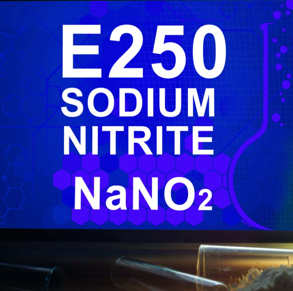 Sodium nitrite is a nitrous acid salt. It has antibacterial and antioxidant properties, therefore it is used in food production as a preservative and, incidentally, as a color fixative. Sodium nitrite is usually listed on labels as an E250 food additive. You can meet it in the composition of boiled, uncooked smoked, salted-smoked and dried meat products (sausages, sausages, etc.), as well as canned meat.