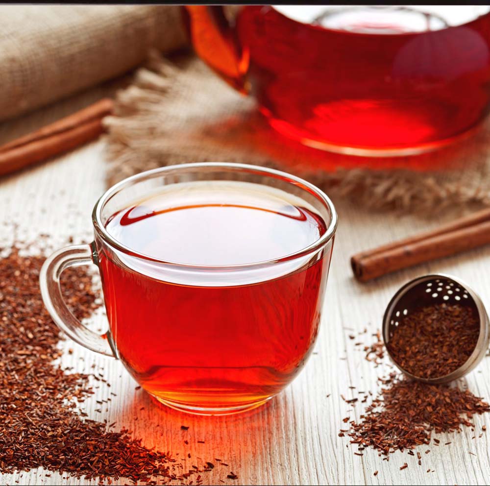 This caffeine-free herbal tea is well-known for its rich, red hue and sweet, earthy, slightly floral flavor. (Not coincidentally, rooibos is also sometimes called “red tea” or “red bush tea.”) It’s derived from the fermented leaves of the Aspalathus linearis shrub, which grows natively in South Africa.